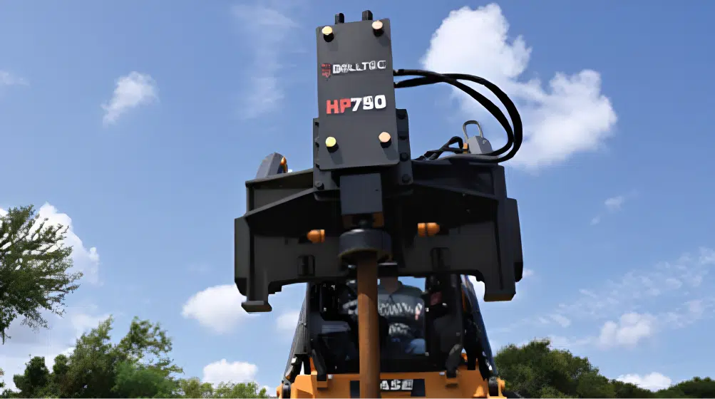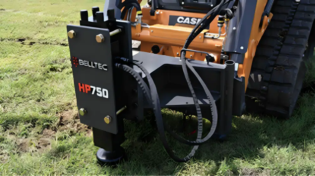 The post driver attachment is designed for quickly and efficiently driving fence posts, signs, and other vertical structures into the ground.